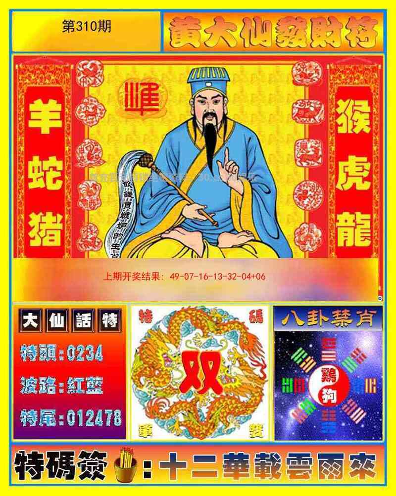 314期:黄大仙心水/简单好下注/台湾玄机诗/港台澳七肖/必中人物